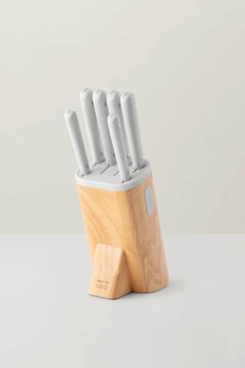 Want to brighten up your kitchen with some color? This 7-pc knife block is the subtle solution to add some color into your kitchen! The knife block contains a versatile knife range such as a paring knife, utility knife, carving knife, bread knife, chef’s knife and santoku knife. In the beautifully designed wooden knife block with glossy top finish, you can easily keep all the knives organized and within reach for efficient food preparation. The knife slots are designed to have a perfect fit for the knife’s bolster; in this way you are 100 % sure of a safe knife storage. The integrated strong magnet on the side allows convenient storage of your scissors or other magnetic kitchen tools