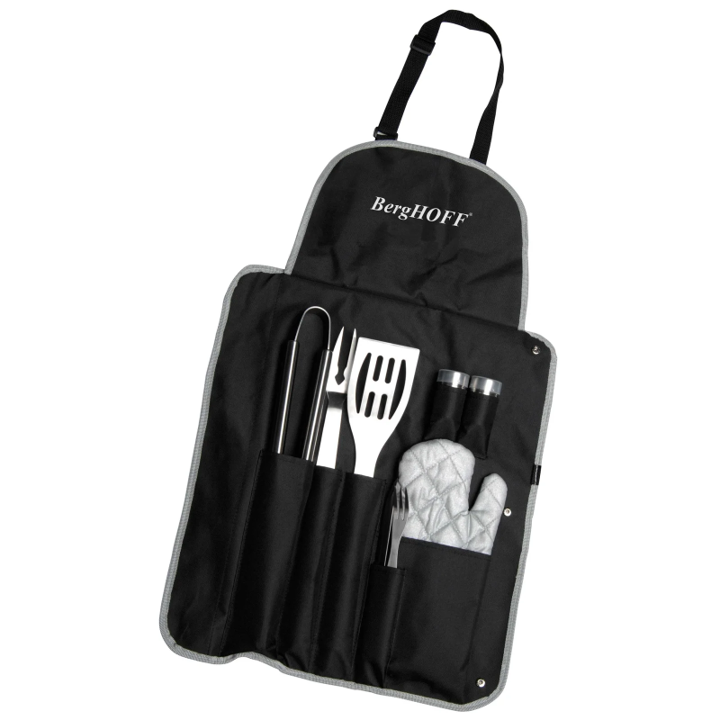 this 9-piece barbecue set is the way to go. It comes in a convenient apron with adjustable neck strap and built-in front pockets for each of the BBQ tools