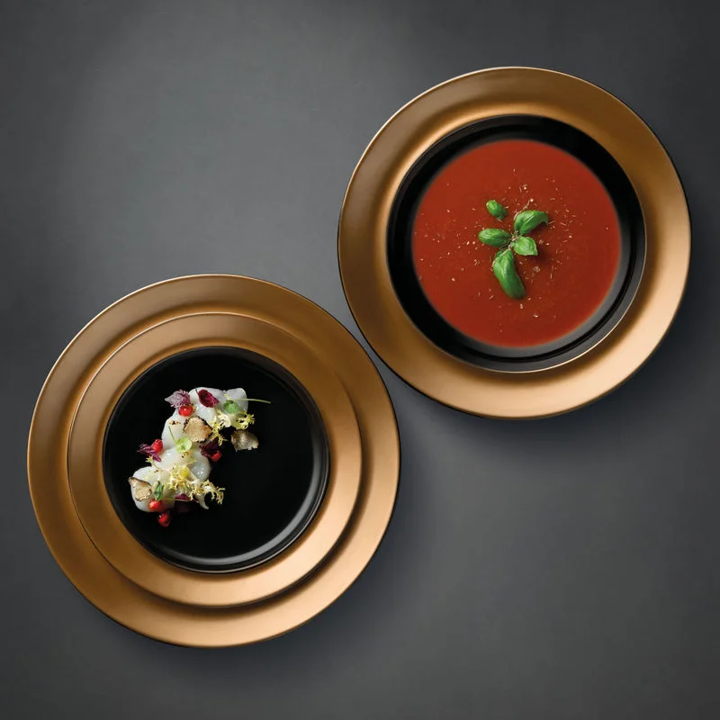 Classy black with a touch of gold, thanks to the modern elegance that this 3-piece plate set brings to the table you’ll easily add a little sparkle to your next dinner party.